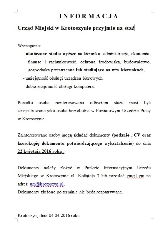 Urząd Miejski w Krotoszynie przyjmie na staż absolwentów studiów wyższych lub studujących na kierunkach: administracja, ekonomia, finanse i rachunkowość, ochrona środowiska, budownictwo, gospodarka przestrzenna. Warunkiem przyjęcia na staż jest także umiejętność obsługi urządzeń biurowych i dobra znajomość obsługi komputera - informuje portal krotoszyńskiego ratusza.