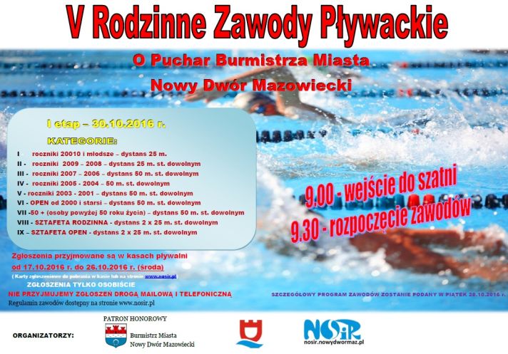 30 października zapraszamy do pływalni NOSIR na V Rodzinne Zawody Pływackie o Puchar Burmistrza Miasta Nowy Dwór Mazowiecki. Zgłoszenia przyjmowane są w kasach pływalni w dniach 17-26 października.