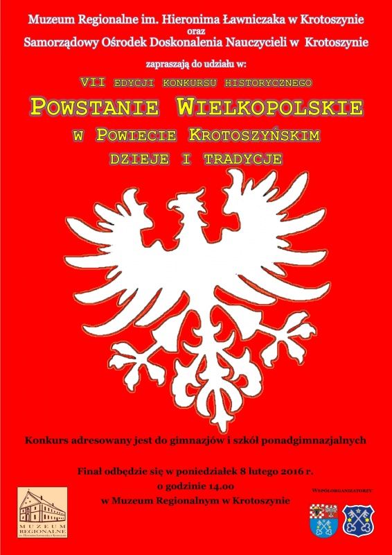 W poniedziałek 8 lutego o godzinie 14.oo w Muzeum Regionalnym odbędzie się powiatowy finał VII edycji konkursu historycznego „Powstanie Wielkopolskie w powiecie krotoszyńskim – dzieje i tradycje”. Konkurs adresowany jest do uczniów gimnazjów i szkół ponadgimnazjalnych powiatu krotoszyńskiego - poinformował portal krotoszyńskiego samorządu.