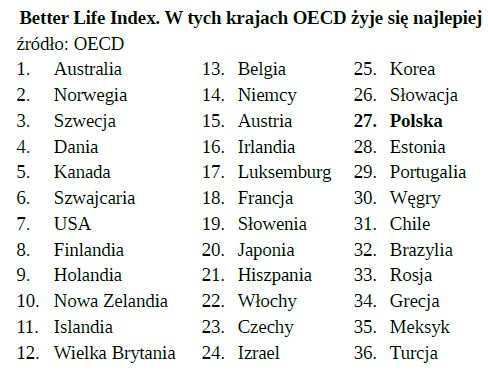 Raport Better Life Index, opublikowany przez OECD rozkłada na czynniki pierwsze elementy życia społeczno-gospodarczego w 36 krajach. Wśród nich są 34 państwa członkowskie oraz dwa aspirujące do dołączenia - Rosja i Brazylia.