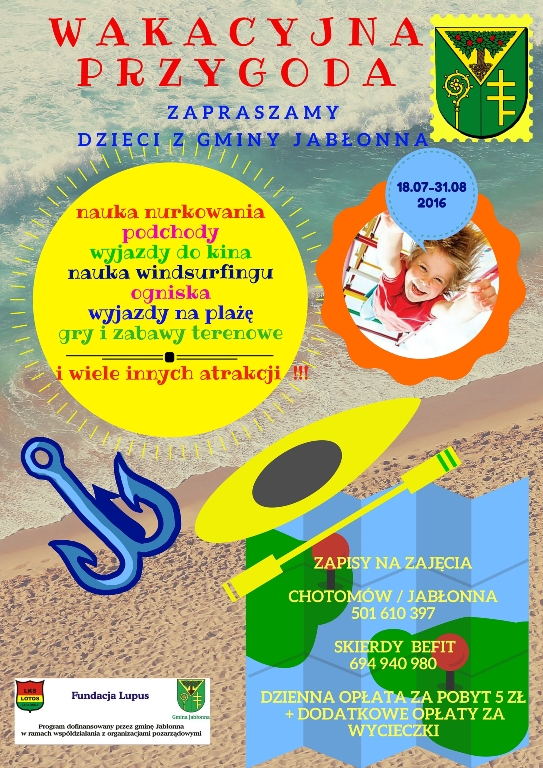 Fundacja Lupus zaprasza dzieci z gminy Jabłonna (powiat Legionowo) do udziału w wakacyjnej przygodzie. Zajęcia odbywać będą się do 31 sierpnia 2016 roku. W programie między innymi: nauka nurkowania, podchody, wyjazdy do kina i na plażę, gry i zabawy terenowe. Zapisy pod numerem telefonu: 501 610 397.