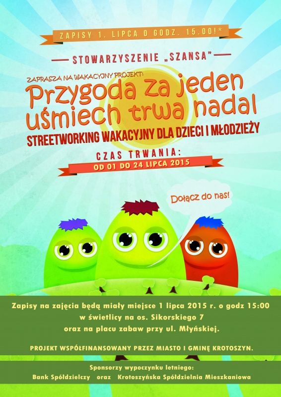 Od 1 do 24 lipca 2015 r. na terenie Krotoszyna Stowarzyszenie „Szansa” będzie realizowało cykliczny wakacyjny projekt pt. „Przygoda za jeden uśmiech trwa nadal – Streetworking wakacyjny dla dzieci i młodzieży”. Celem projektu jest organizacja czasu wolnego dla dzieci i młodzieży pozostającym na terenie Krotoszyna bez opieki i nie mających dla siebie atrakcyjnej oferty wypoczynku letniego - informuje portal krotoszyn.pl.