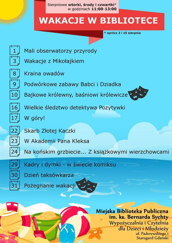 Serdecznie zapraszamy dzieci wraz z rodzicami w sierpniowe wtorki, środy i czwartki (oprócz 2 i 15 sierpnia), w godz. 11:00-13:00 na tematyczne wydarzenia łączące zabawę z nauką oraz popularyzujące czytanie książek wśród dzieci.