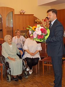 Wiceprezydent Radomia Jerzy Zawodnik wręczył kwiaty i złożył życzenia w 101. urodziny Ireny Miazgi w Domu Pomocy Społecznej