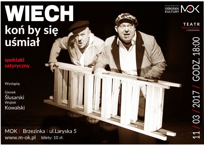 Spektakl „Wiech - koń by się uśmiał” w wykonaniu Teatru Wojtka Kowalskiego z Częstochowy to kolejna propozycja teatralna przygotowana przez MOK. Satyryczną sztukę zobaczymy 11 marca, o godz. 18:00, w MOK-u na Brzezince, ul. Laryska 5.