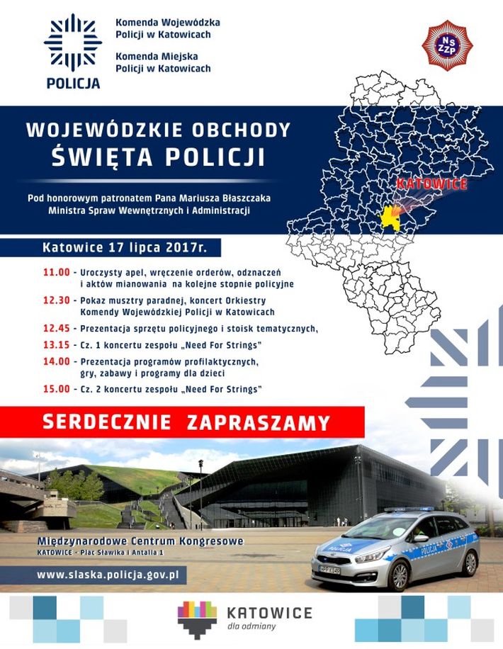 Zapraszamy na wojewódzkie obchody Święta Policji, które odbędą się 17 lipca, na terenie Międzynarodowego Centrum Kongresowego w Katowicach.