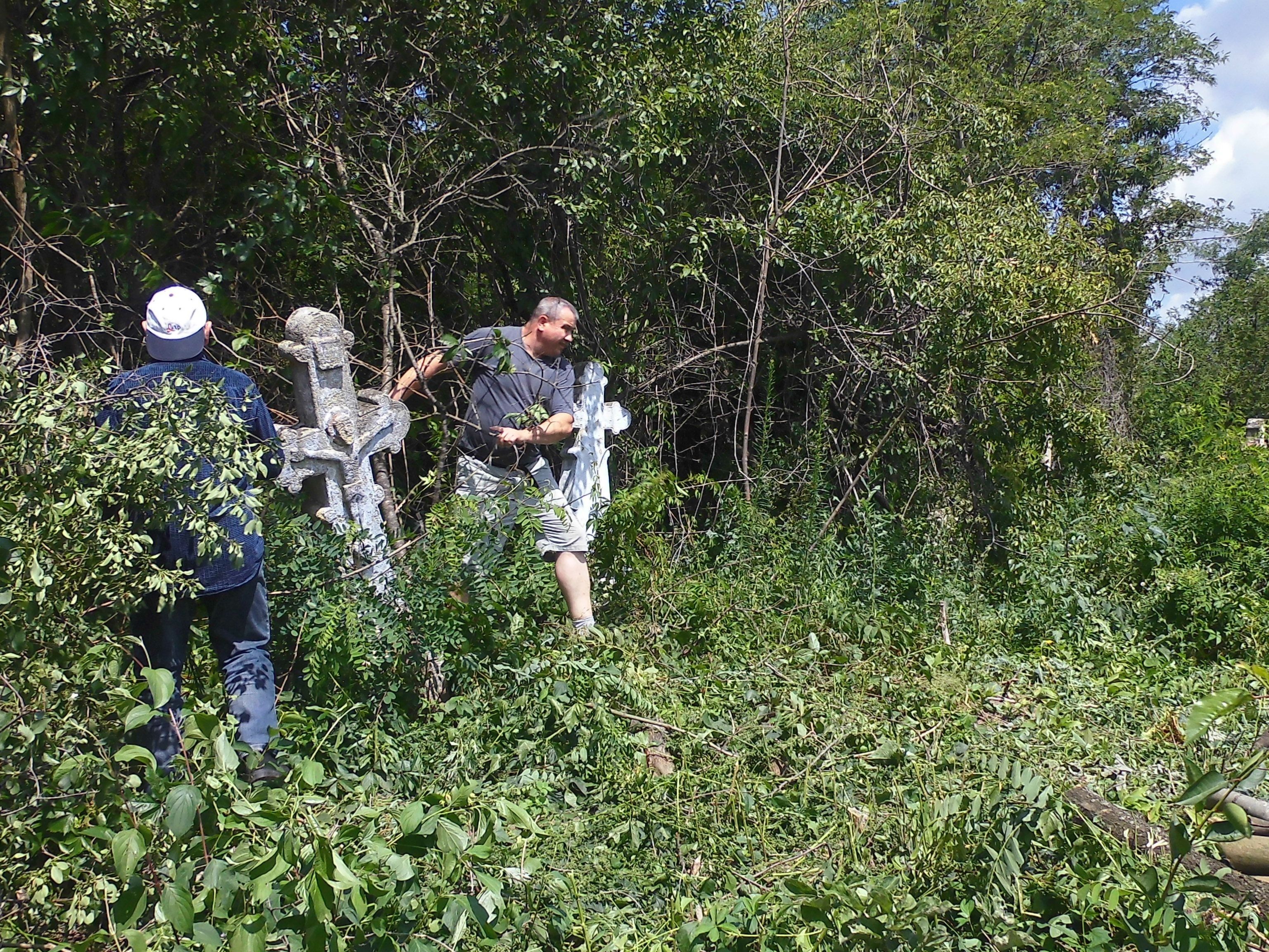 – Narzekanie nie na wiele by się jednak zdało – dodaje Jacek Sadlik. – Uruchomiłem więc piłę spalinową, a Witek Zagrodny kosiarkę i ostro zabraliśmy się do roboty. W pracach, pomimo żaru lejącego się z nieba (temperatura często dochodziła do 30°C), dzielnie wspomagała nas młodzież. Chłopcy rozpalili ogniska, na które znosili wycięte przez nas drzewa i krzaki. Z kolei dziewczęta zajęły się drobniejszymi pracami, wycinaniem chwastów i czyszczeniem pomników. Dzięki tej pracy odkryliśmy kolejne mogiły, w tym również wiele polskich.