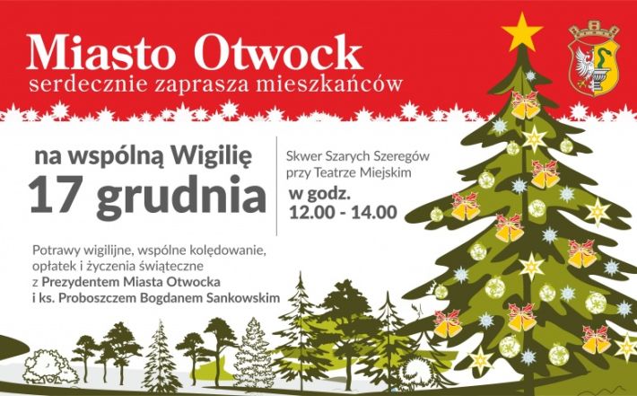Serdecznie zapraszamy mieszkańców Otwocka na wspólną wigilię z prezydentem miasta i ks. proboszczem Bogdanem Sankowskim, która odbędzie się 17 grudnia, o godz. 12:00 na skwerze Szarych Szeregów, przy teatrze.