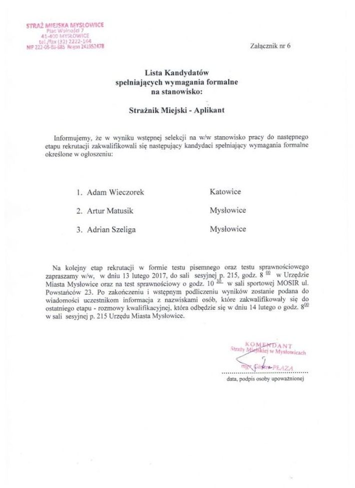 Wynik konkursu na stanowisko pracy - strażnik miejski