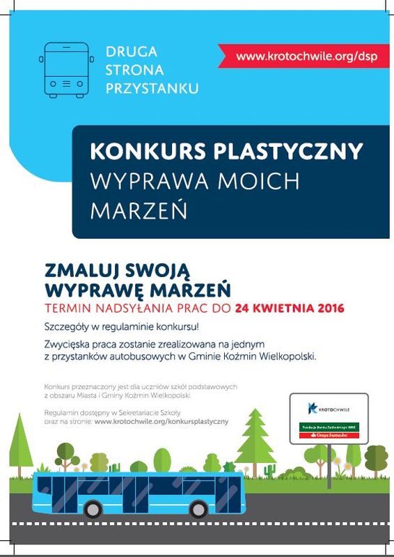 Projekt „Druga strona przystanku” ma na celu zagospodarowanie mało estetycznych elementów przestrzeni publicznej w gminie Koźmin Wielkopolski, a konkretnie betonowych wiat przystankowych, z których codziennie korzystają mieszkańcy. Przystanki zyskają nowy wygląd, zostaną także wyposażone w ławkę i zieleń. Dzięki temu oczekiwanie na autobus będzie przyjemniejsze, a wyjątkowy wygląd wiat będzie niewątpliwą promocją dla gminy.Wyprawa moich marzeń - regulamin konkursu plastycznego.pdf