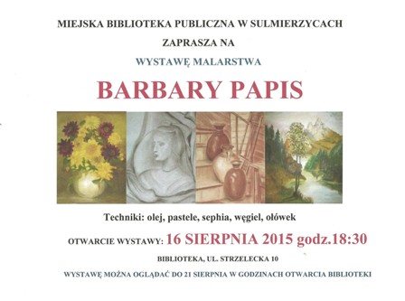 Miejska Biblioteka Publiczna w Sulmierzycach (powiat Krotoszyn) zaprasza na wystawę malarstwa Barbary Papis.