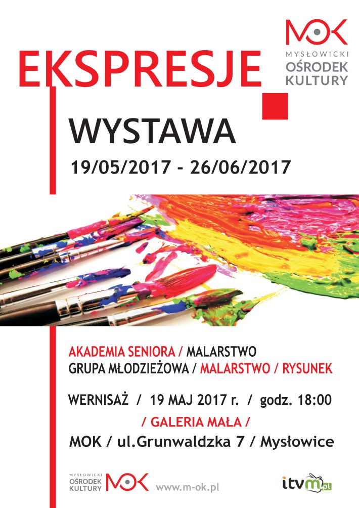 Wystawa ”Ekspresje” to zbiór artystycznej twórczości ostatnich miesięcy mysłowickich seniorów i młodzieży. Obie grupy działają w MOK, pod opieką mysłowickiej plastyczki Ewy Borówki. Na wystawie będzie można podziwiać prace malarskie w technice akrylu, akwareli, rysunku i pasteli.