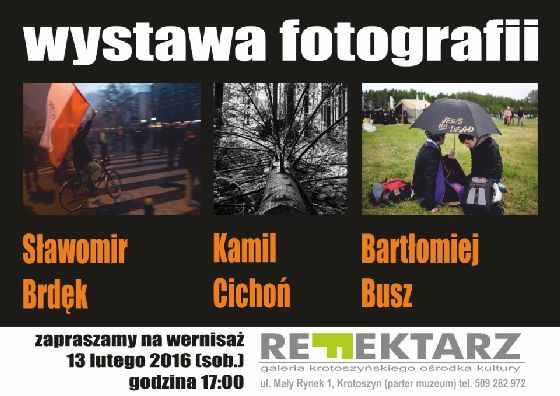 Kolejna wystawa prezentowana w Galerii Refektarz Krotoszyńskiego Ośrodka Kultury to prace trzech młodych artystów fotografików z Ostrzeszowa. Sławomir Brdęk, Kamil Cichoń oraz Bartłomiej Busz zaprezentują swoje autorskie zestawy fotografii głównie dokumentalnej i reportażowej, bo jak sami mówią taka forma fotografii jest im najbliższa - pisze portal krotoszyńskiego samorządu.