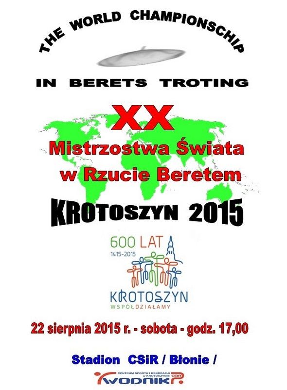 22 sierpnia 2015 roku na stadionie CSiR w Krotoszynie, przy ul. Sportowej odbędą się XX Mistrzostwa Świata w Rzucie Beretem - Krotoszyn 2015