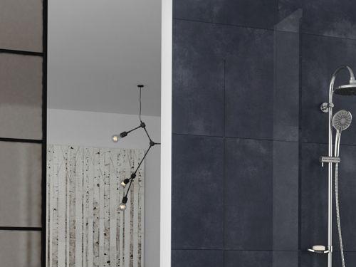 W otwartej przestrzeni prysznica wspaniałą dekoracją jest komplet Trinity marki Ferro, który składa się z deszczowni, rączki natryskowej i baterii termostatycznej. Estetyka idzie w parze z funkcjonalnością. Solidnie wykonane, metalowe mocowanie sprawia, iż zestaw jest trwały i stabilny, a możliwość zmiany wysokości drążka o długości 110 cm i regulowany odstęp od ściany są jego dodatkowym atutem. Drążek deszczowni jest dokręcany bezpośrednio do baterii termostatycznej z wyjściem górnym, dlatego nie ma konieczności łączenia go z nią za pomocą wężyka, z kolei rączka natryskowa jest umocowana na regulowanym uchwycie. Przełączanie źródła wody między deszczownią a rączką natryskową odbywa się w sposób intuicyjny, dzięki zastosowaniu przełącznika z wkładką ceramiczną w metalowej obudowie.