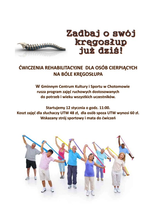 W chotomowskiej Filii Gminnego Centrum Kultury i Sportu ruszają nowe zajęcia dla osób cierpiących na bóle kręgosłupa. Pierwsze spotkanie odbędzie się 12 stycznia 2017 r. o godz. 11.00 w siedzibie GCKiS przy ul. Partyzantów.