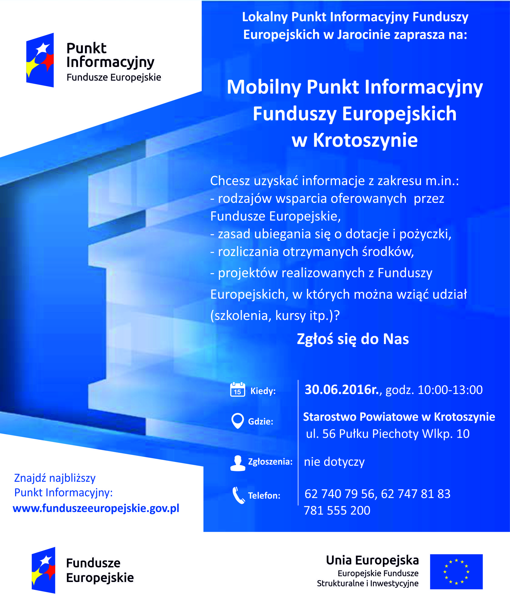 W najbliższy czwartek, 30 czerwca 2016 r., odbędzie się kolejny dyżur specjalisty ds. Funduszy Europejskich w ramach Mobilnego Punktu Informacyjnego - informuje portal krotoszyńskiego Starostwa Powiatowego.