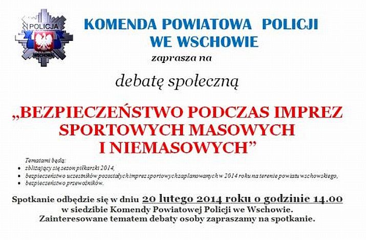 W dniu 20 lutego 2014 r. o godz. 14.00 w siedzibie Komendy Powiatowej Policji we Wschowie odbędzie się debata społeczna pn.”Bezpieczeństwo podczas imprez sportowych masowych i niemasowych”.