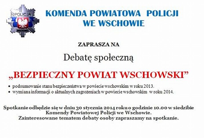 Serdecznie zapraszamy mieszkańców powiatu wschowskiego na debatę społeczną pn. "Bezpieczny powiat wschowski”, która odbędzie się w dniu 30 stycznia 2014 r. o godz. 10.00 w siedzibie Komendy Powiatowej Policji we Wschowie przy ul. K. Wielkiego 12.