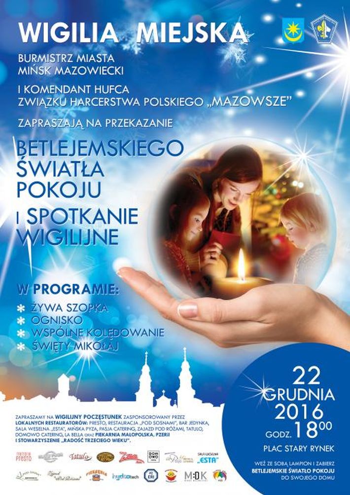 Spotkanie wigilijne dla mieszkańców, przy poczęstunku przygotowanym non profit przez mińskich restauratorów. Zaprasza burmistrz miasta i komendant Hufca ZHP Mazowsze, 22 grudnia o godz. 18:00, Stary Rynek.