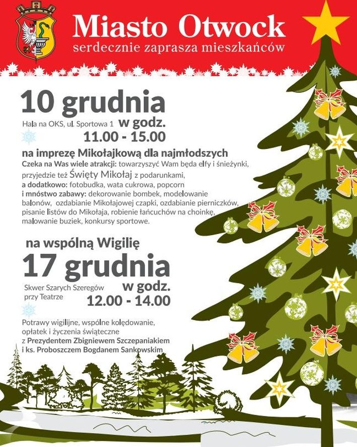 Miasto Otwock serdecznie zaprasza mieszkańców na imprezę mikołajkową dla najmłodszych i wspólną Wigilię Bożego Narodzenia.