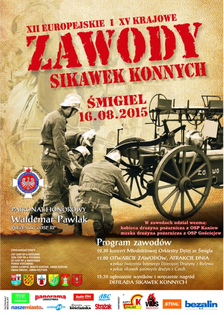 Strażaczki z OSP Kaniew oraz strażacy z OSP Gościejew zapraszają kibiców strażackiego współzawodnictwa na XII Europejskie i XV Krajowe Zawody Sikawek Konnych, które odbędą się tym razem w niedzielę 16 sierpnia w Śmiglu (powiat kościański) - informuje portal Gminy Koźmin Wielkopolski (powiat Krotoszyn).