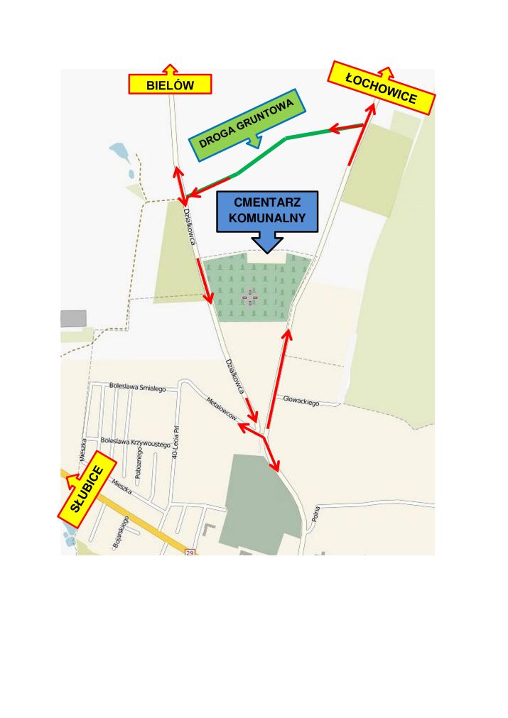 - od bramy głównej wjazdowej na cmentarz, ul. Kujawska do skrzyżowania z ul. Cmentarną, wyłączony będzie jeden pas ruchu, na którym także będzie obowiązywał całkowity zakaz zatrzymywania się i postoju,