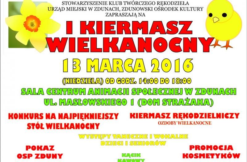 W najbliższą niedzielę (13 marca) w Centrum Animacji Społecznej w Zdunach (powiat krotoszyński) odbędzie się I Kiermasz Wielkanocny - poinformował portal gminy Zduny.