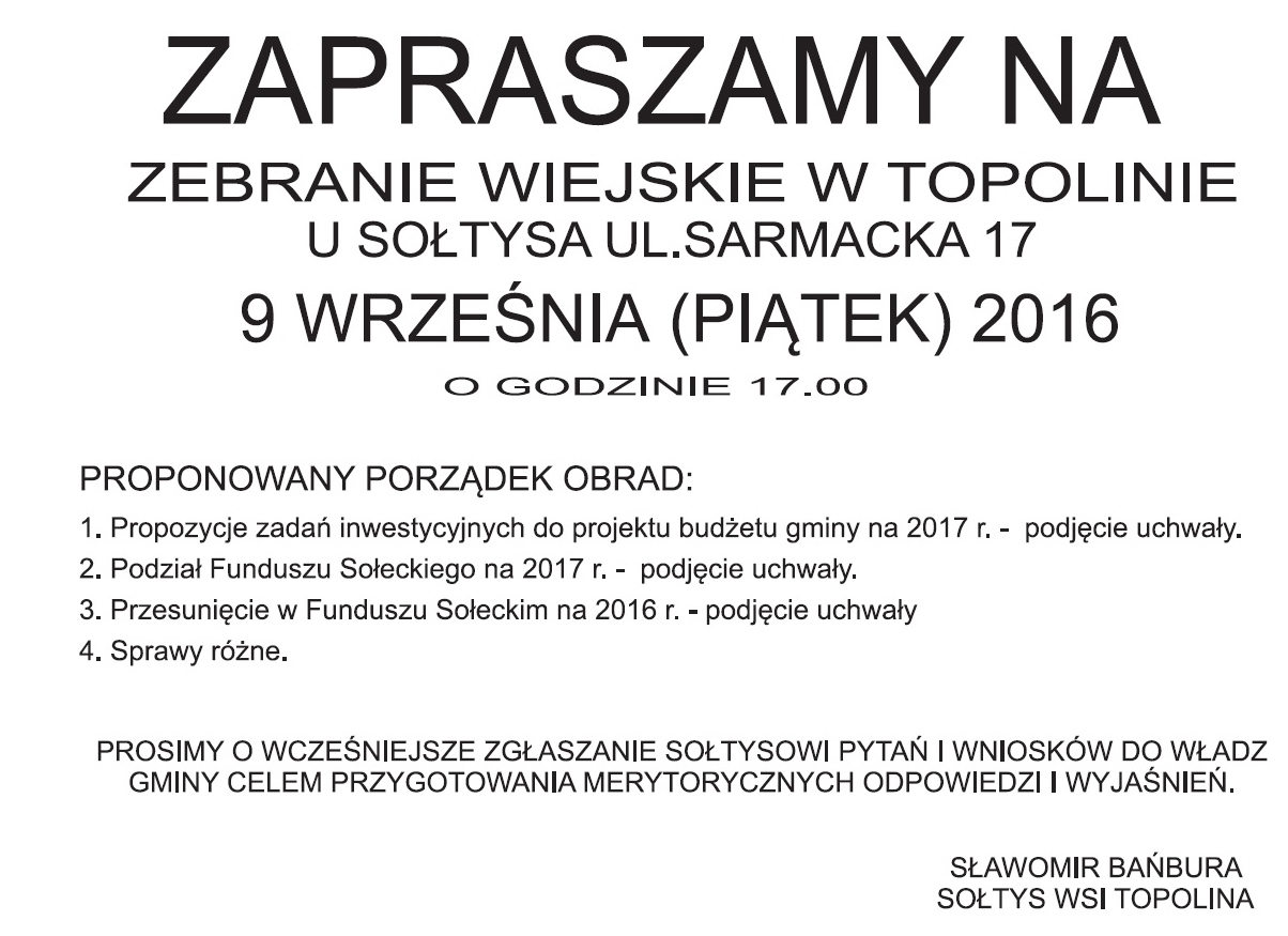 Zapraszamy na zebranie wiejskie mieszkańców wsi Topolina (powiat legionowski), które odbędzie się w dniu 9 września 2016 r. /piątek/, o godz. 17.00.
