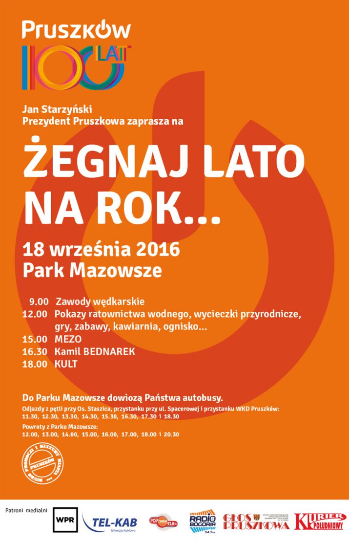 Prezydent Miasta Pruszkowa Jan Starzyński zaprasza mieszkańców 18 września do parku Mazowsze na wspólne pożegnanie lata. Festyn „Żegnaj lato na rok..." odbędzie się w godz. 12:00-20:00, a na miejscu, jak zawsze w czasie miejskich imprez plenerowych czeka wiele atrakcji.