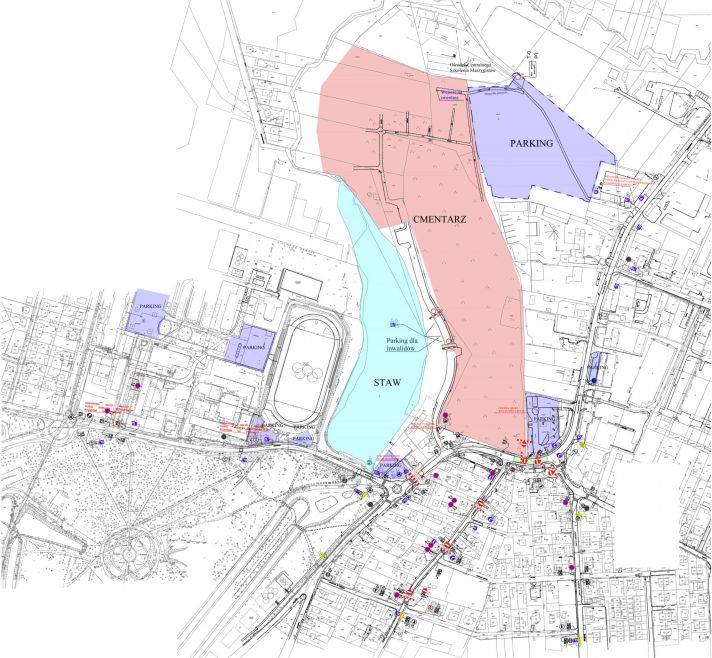 Od strony ul. Budowlanej do parkingu na tyłach cmentarza poprowadzony będzie objazd ul. Kościelną, Kazimierza III Wielkiego, Żwirki, Żwirową i Przemysłową.