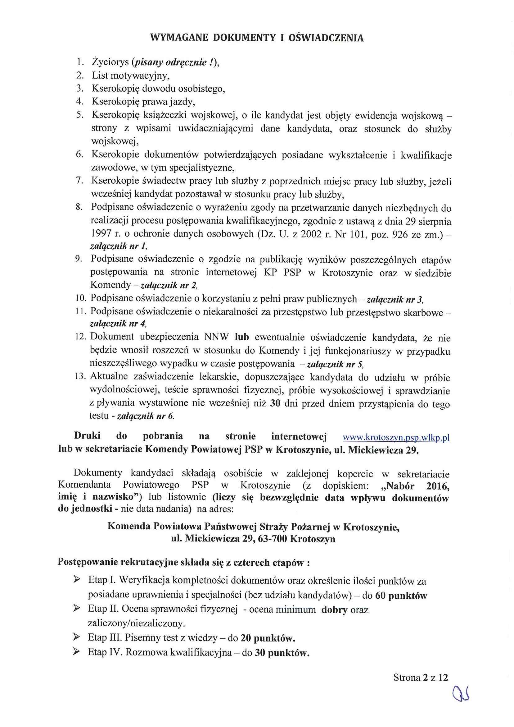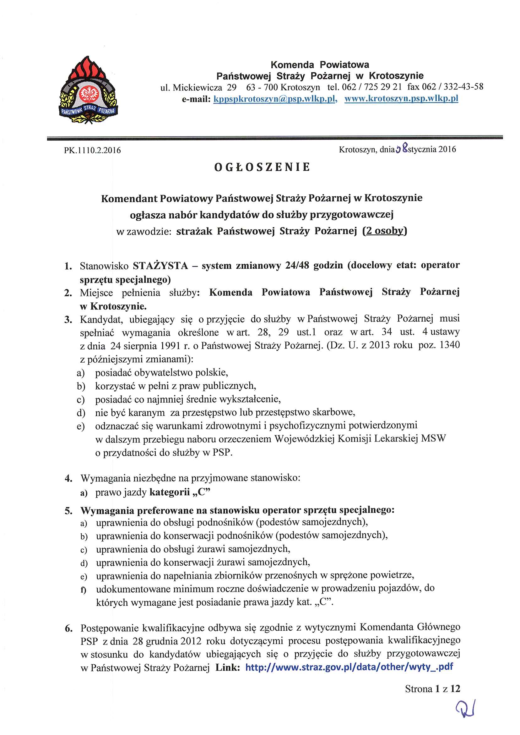 Komendant Powiatowej Państwowej Straży Pożarnej w Krotoszynie ogłasza nabór kandydatow do służby przygotowawczej w zawodzie strażak Państwowej Straży Pożarnej.