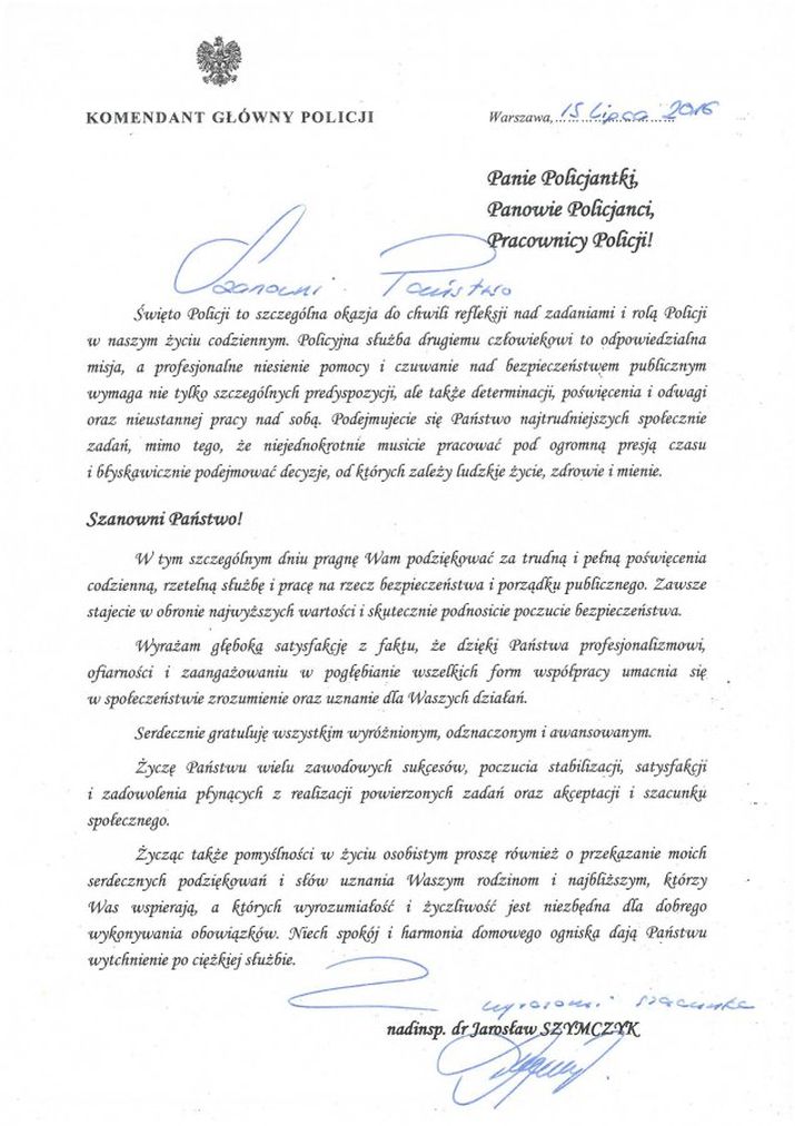 Z okazji Święta Policji, komendant główny policji nadinsp. dr Jarosław Szymczyk w imieniu własnym i kierownictwa złożył specjalne życzenia wszystkim policjantkom, policjantom i pracownikom policji. (jkd)